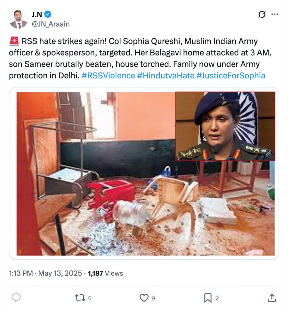 After the recent India-Pakistan conflict, an image of a vandalised home was shared on social media alongside a picture of Colonel Sofia Qureshi. Those sharing the image claimed that Colonel Qureshi’s house in Belagavi, Karnataka, was attacked by RSS (Rashtriya Swayamsevak Sangh) goons.