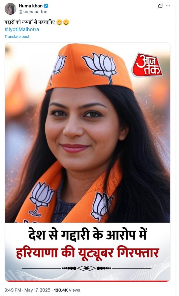 Recently, Jyoti Malhotra, a YouTuber from Hisar, Haryana, was arrested by the NIA on charges of spying for Pakistan and sharing sensitive information. Meanwhile, two pictures of Malhotra wearing BJP and Aam Aadmi Party election caps and scarves are viral on social media. The pictures also have the logo of Aaj Tak news channel. Many users are sharing it on social media believing it to be true.