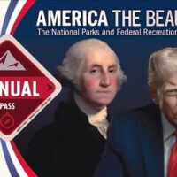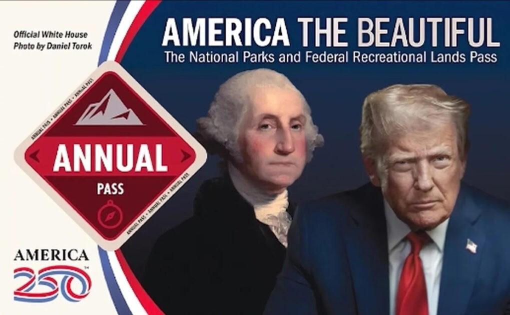 The 2026 America the Beautiful pass features George Washington and President Donald Trump. (screenshot via Department of Interior)