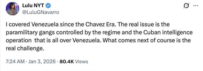 + Eva Golinger: “A U.S. indictment does not give legal authority to invade another country and capture the individual indicted. No matter the spin and disdain for Maduro, it was still an illegal operation. There was no imminent threat from Maduro against the US that would justify this action.”