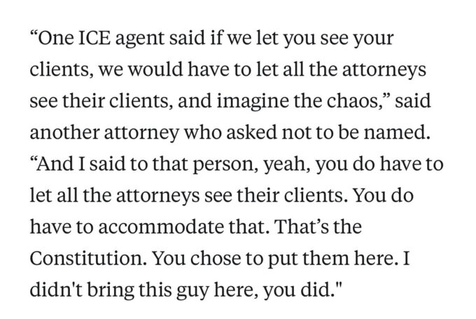 + ICE is shredding the Bill of Rights one amendment after another. Its agents now claim it would cause “chaos” to let people it arrested and detained see their lawyers…