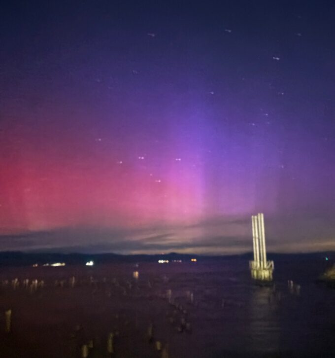 + The Aurora at about 3 AM on Tuesday (made slightly more spectacular looking by my iPhone’s obnoxious night mode), looking across the Columbia River toward the old fishing village of the Clatsop people that Lewis & Clark called Dismal Nitch, because like almost everything else on the north side of the river, it was exposed to lashing winter rains. Not on this night, however, when the winds were coming from the east out of the frigid high desert and the skies were clear and studded with stars and surreal multi-colored curtains of light.