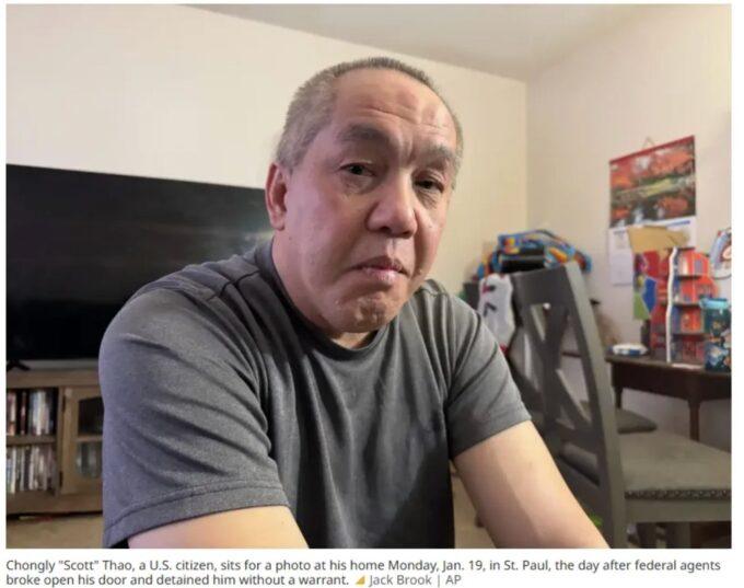 + ICE conducted a warrantless raid on the home of an elderly US citizen named Chongly “Scott” Thao, dragged him out of the house into freezing temperatures in his underwear, perp-walked him in front of the press, and accused him first of being a child molester, then, after that libel fell apart, of housing two sex offenders–allegations which seem to have been completely invented to justify this abusive and unconstitutional home invasion, arrest and detention.