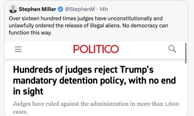 + Here’s Stephen Miller threatening federal judges, who have struck down the Constitutionality of the Trump administration’s novel legal defenses for its abusive treatment and detention of migrants. But it’s not even a close call. By a margin of 335 to 18, federal judges have ruled against the Trump administration in these cases. Even Trump appointees have ruled 33-15 against the Trump administration.