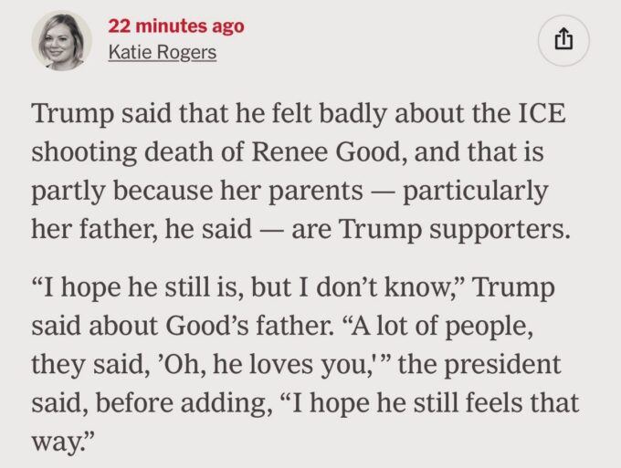 + Renee Good still had a pulse when paramedics (who had to trek across the snow several blocks on foot because ICE blocked the ambulance from entering Portland Ave) reached her, more than 15 minutes after she was shot and ICE refused to allow a physician on the scene to treat her wound. They wanted the “fuckin’ bitch” dead.